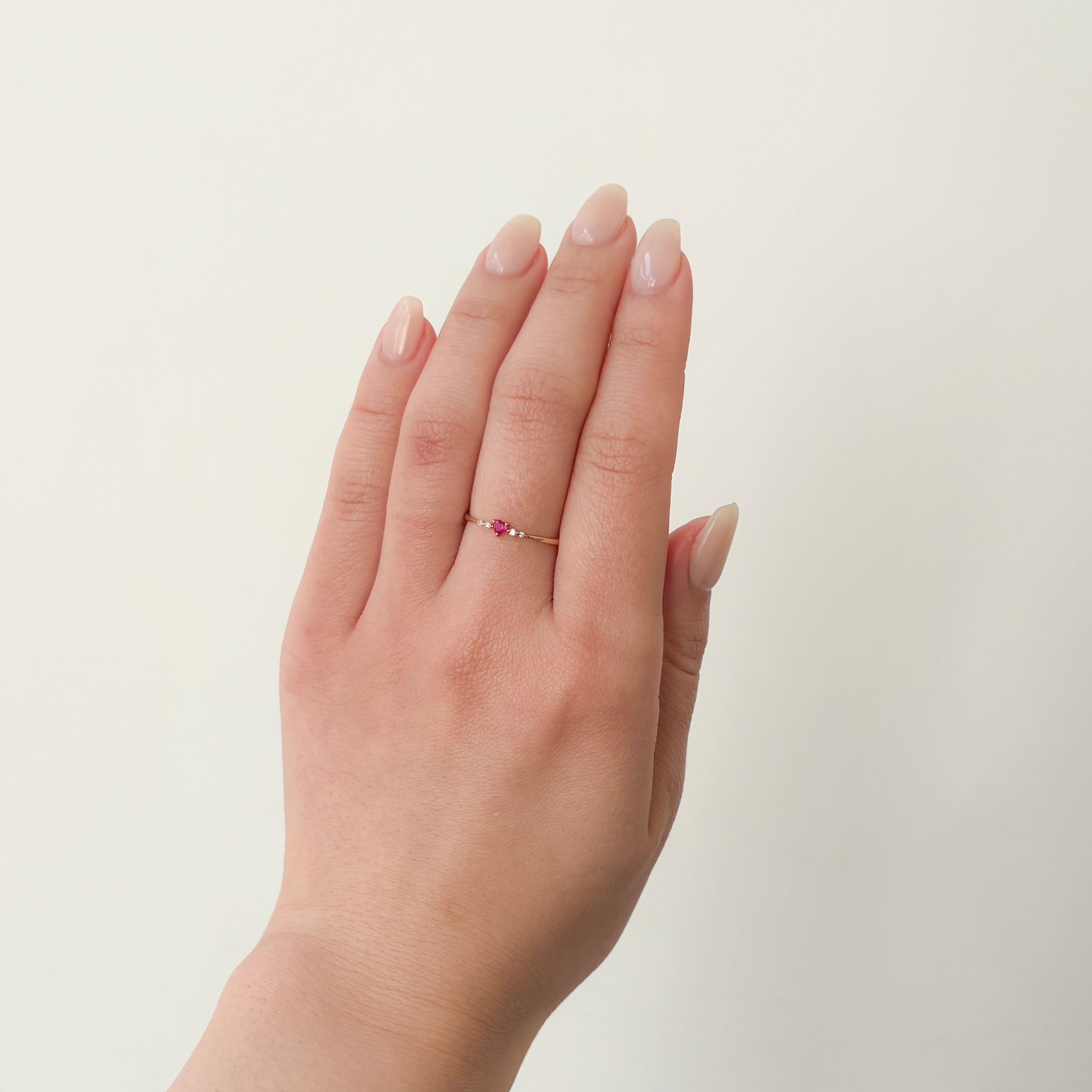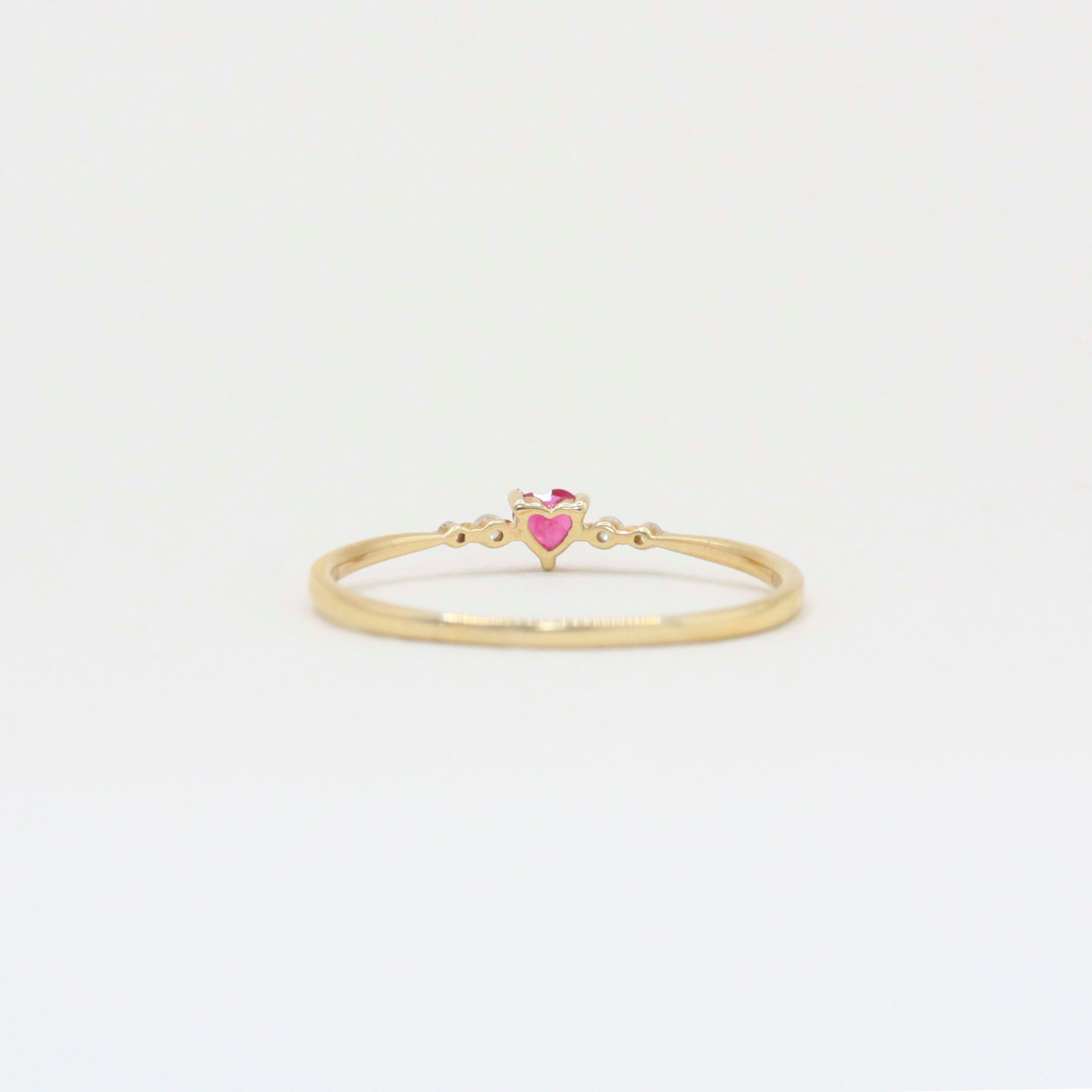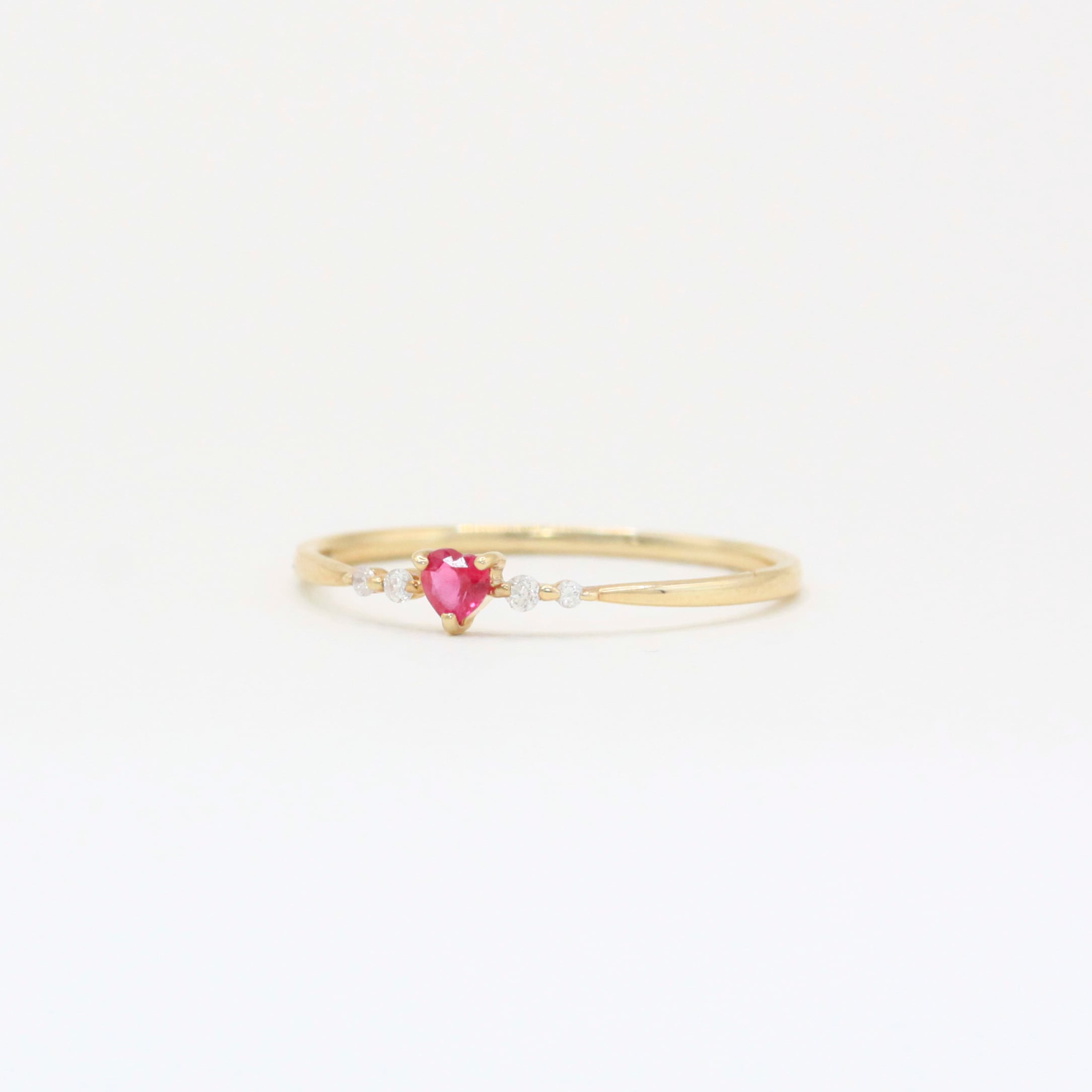 ルビーの周りにダイヤモンドをあしらい、甘すぎない大人のハートリング。